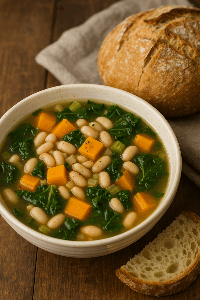 This fall, we are adding a practical piece you can try at home: a White Bean, Sweet Potato and Collard Greens Soup paired with a quick 3-ingredient homemade bread.