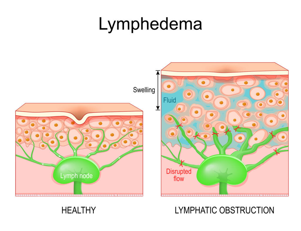 The lymphatic system plays a critical role in fluid balance and immune function. When lymph vessels or lymph nodes are damaged, due to surgery, cancer treatment, infection, trauma, or chronic venous disease, fluid may no longer drain properly. Over time, this leads to swelling, tissue changes, and increased risk for infection and skin breakdown.
